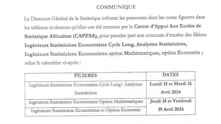 Quid sur l'avis de concours pour les Ingénieurs Statisticiens. La Direction Générale de la Statistique publiera la liste des candidats retenus ainsi que les dates dudit concours. Direction Générale de la Statistique…