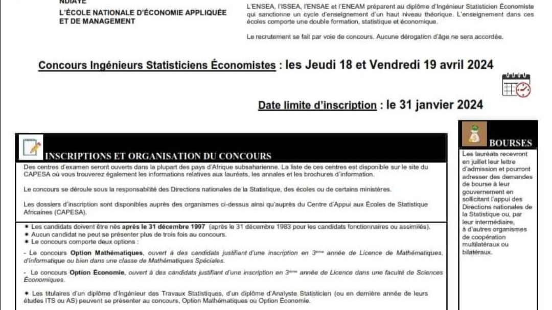 Concours pour Ingénieurs Statisticiens Economistes (ISE) cycle court, option Mathématiques et option Economie. Pour Ingénieurs Statisticiens Economistes (ISE) cycle long, pour Analystes Statisticiens (AS)…